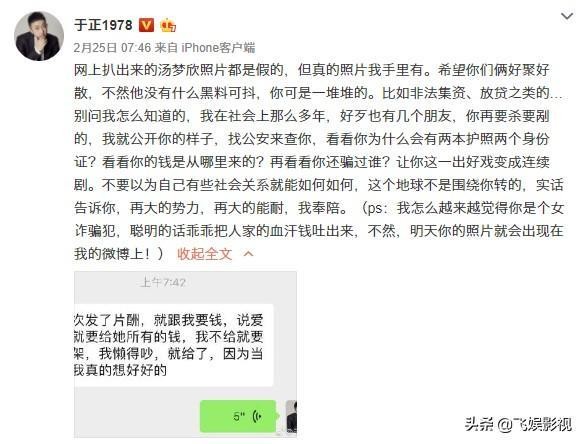 事件隔了一个星期,就在热度消退的时候,赵弈钦的前女友汤梦欣发长文对于正的爆料做出了回击,最直接有力的回击就是晒证据准备起诉,汤梦欣表示于正的爆料均为不实信息,赵弈钦转给自己的片酬根本没有100万,也不够花,都用在了为其购买奢侈品,超支的部分还是自己倒贴补齐的,自己仅仅接受过一条项链和两束花。