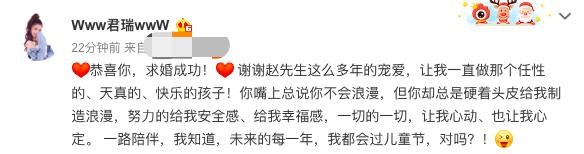 随后赵继伟的未婚妻王君瑞也转发了求婚照,并写道“谢谢赵先生这么多年的宠爱,让我一直做那个任性的、天真的、快乐的孩子!”