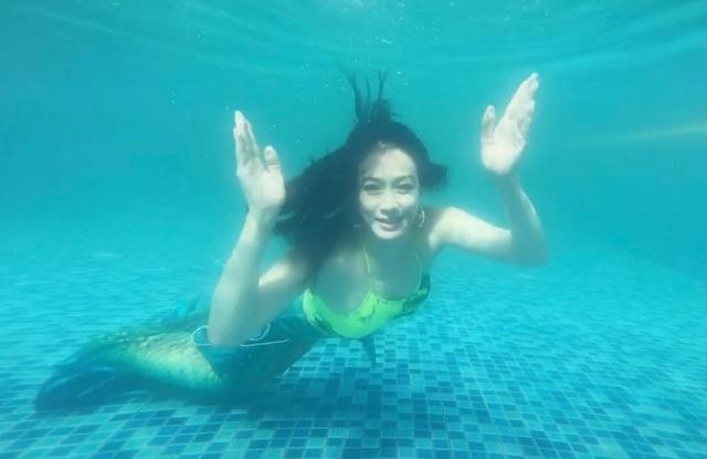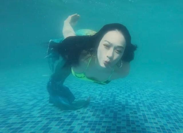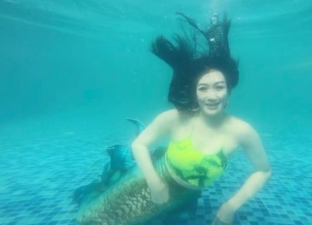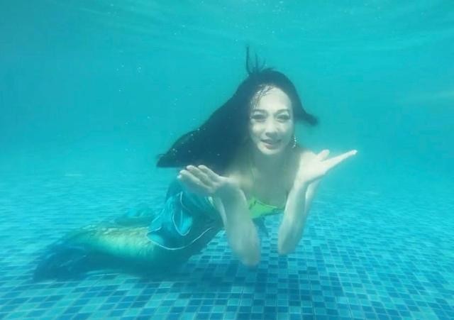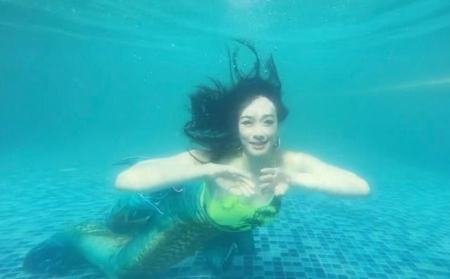 钟丽缇换上鱼尾裙后,险些站不稳,还直言水特别冰冷,但为了拍好美人鱼变装视频,一切都值得。