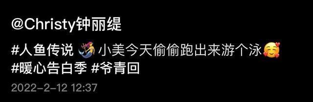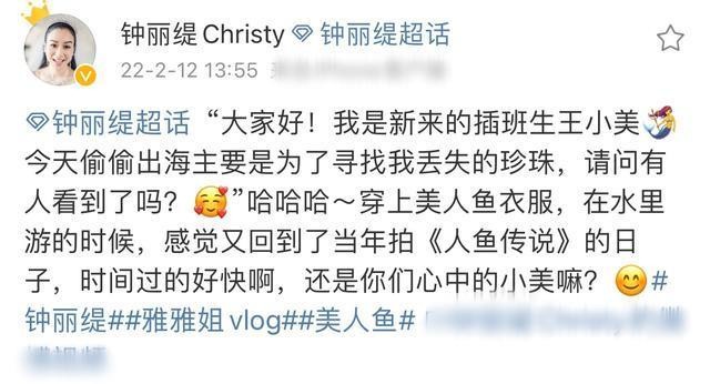 2月12日,钟丽缇时隔28年再次扮演美人鱼,再现电影中的名场面,并在社交平台上更新一则视频,配文:“小美今天偷偷跑出来游个泳。”