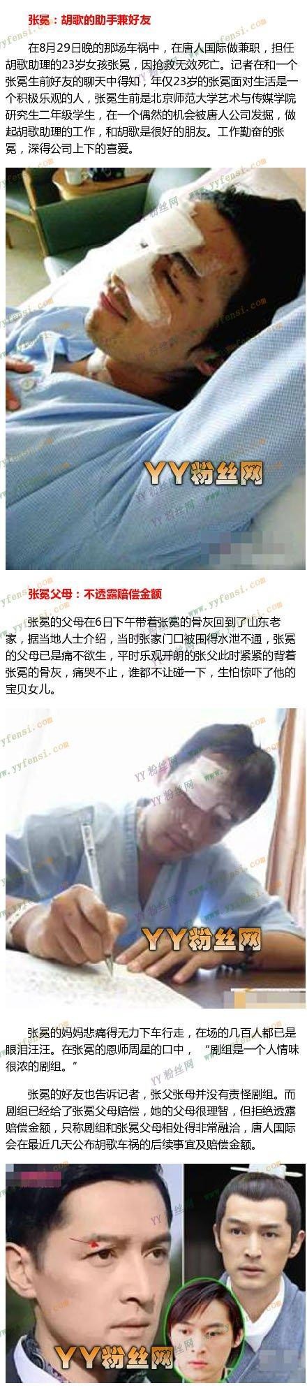 据车祸事后的新闻爆料称,张冕当时只有23岁,生前是北京师范大学艺术与传媒学院研究生二年级学生,是因为一个偶然的机会被唐人发掘成为了胡歌的助理的,而在那场车祸中,张冕属于头部重创,经过一系列的抢救之后还是没有办法把她从死亡线上拉回来,最终在8月30日的凌晨一点钟离开了大家。