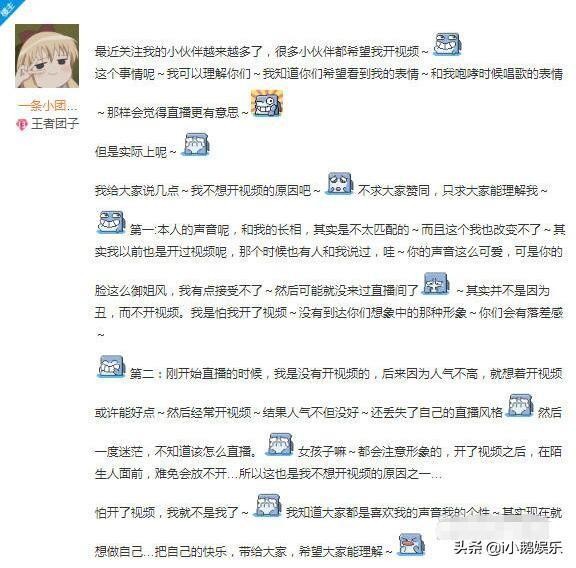 “一条小团团OvO”在之前对于自己不开视频直播也是做了一个解释,许多粉丝也是希望“一条小团团OvO”能在直播的时候开启视频。对于这个问题“一条小团团OvO”讲述自己不开视频的原因,一方面是由于自己的声音和自己“御姐范儿”的长相十分不协调,另一方面自己在开始直播的时候开了视频直播效果不好,也和自己的直播风格有些突兀。