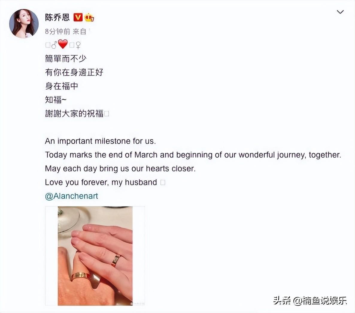 #陈乔恩Alan登记结婚##陈乔恩艾伦甜蜜恋情回顾##陈乔恩晒与男友艾伦甜蜜日常##经纪人证实陈乔恩Alan结婚##陈乔恩晒与Alan婚戒#