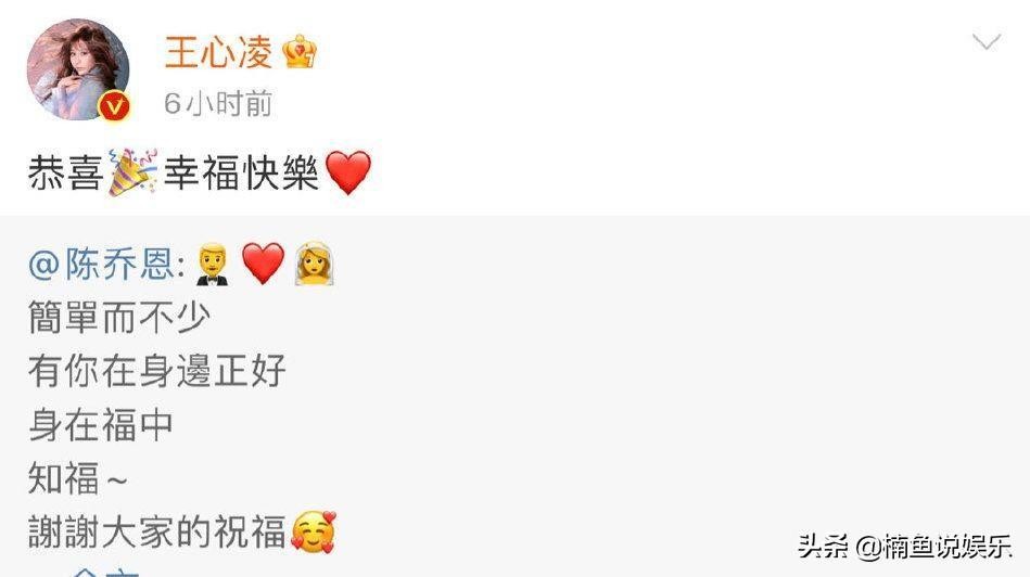 同时,作为陈乔恩好友的王心凌也在社交平台为好姐妹送上祝福,看到陈乔恩收获幸福终于圆满,王心凌也发自内心地替姐妹开心。好像在3月的最后一天,娱乐圈的很多明星们纷纷办完了自己的终身大事,前有韩星玄彬和孙艺珍举办婚礼,后有陈乔恩Alan登记结婚,娱乐圈又增添了一丝喜庆。