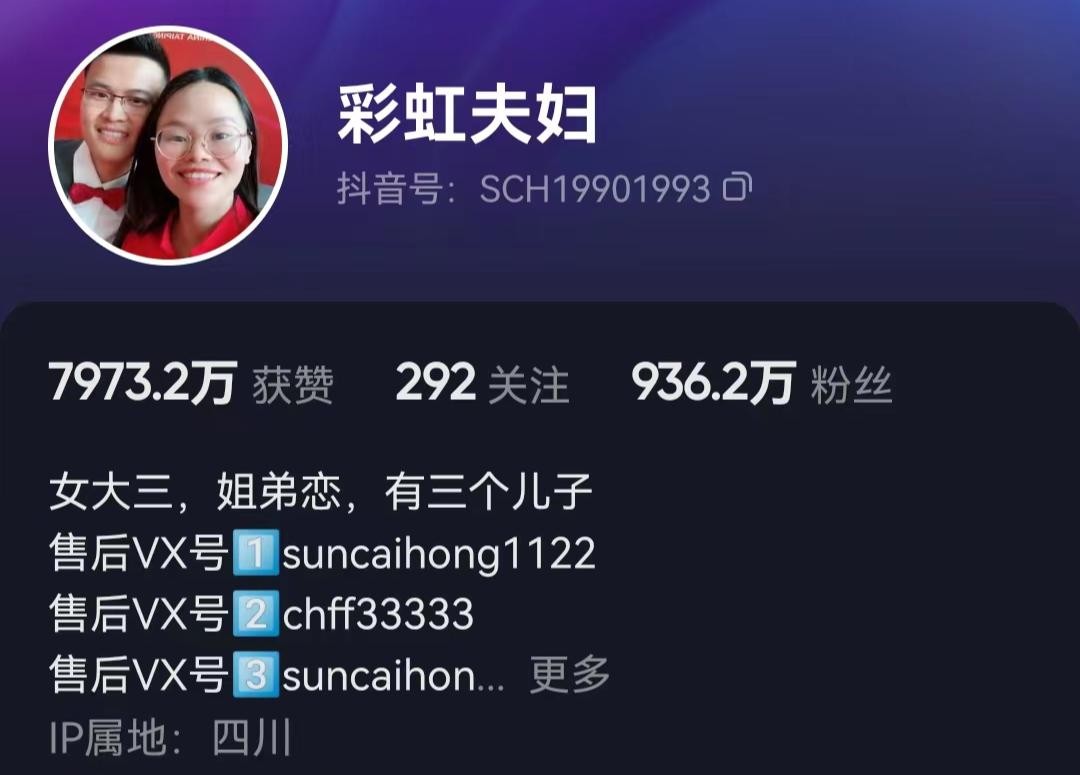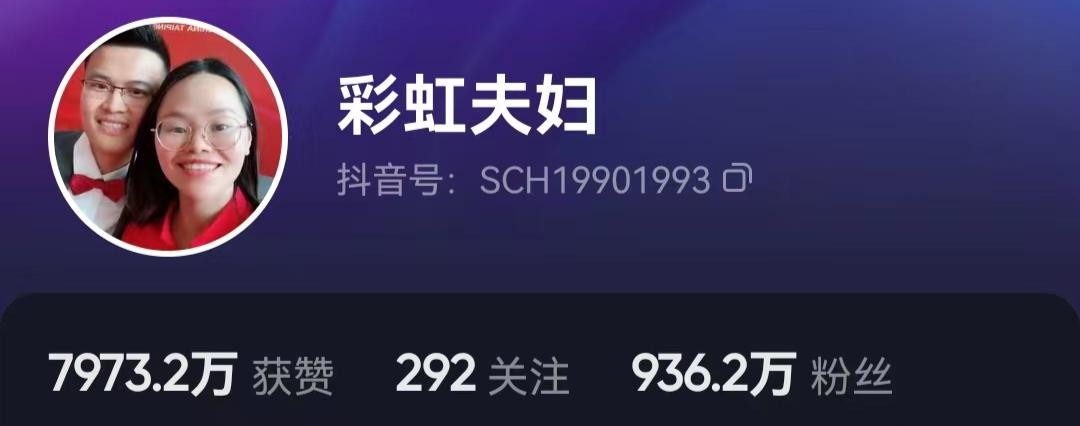 彩虹夫妇的主要阵地在抖音,目前他们的抖音账号已经拥有了936.7万粉丝,账号是一对夫妻档,90后女主播孙彩虹,与丈夫郭斌结婚十年,是一对纯素人夫妻。