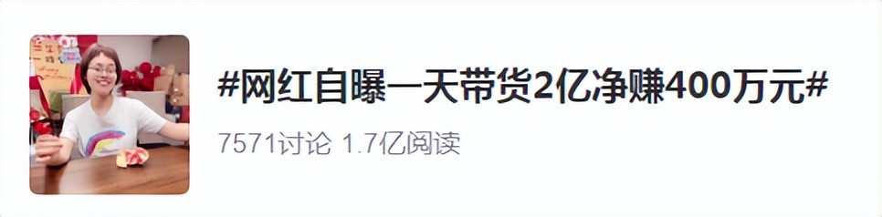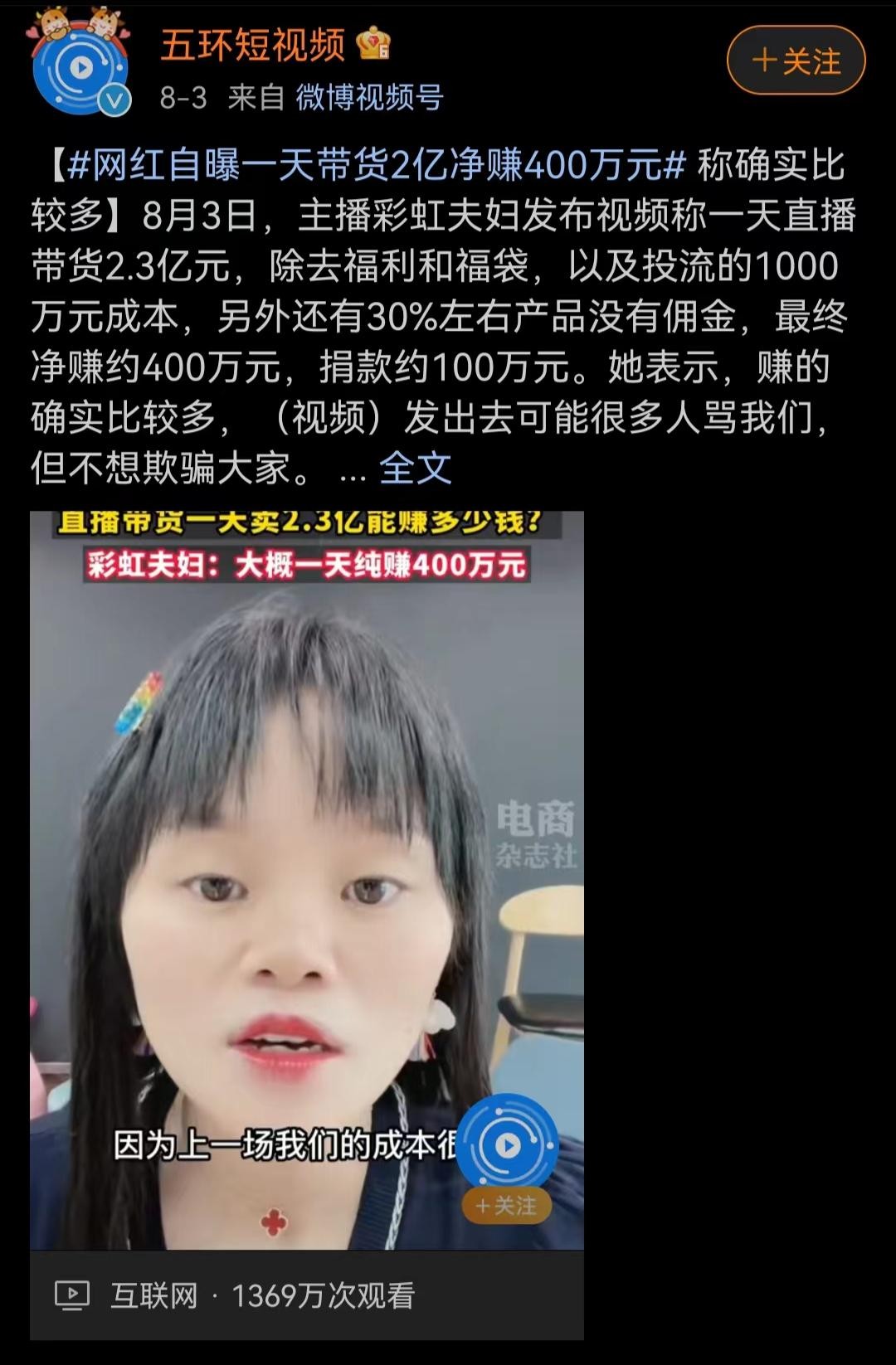8月3日,一则“网红自曝一天带货2亿净赚400万元”的话题上了微博热搜,于是人们开始关注一天赚到400万的人,网红主播彩虹夫妇自此出了圈!