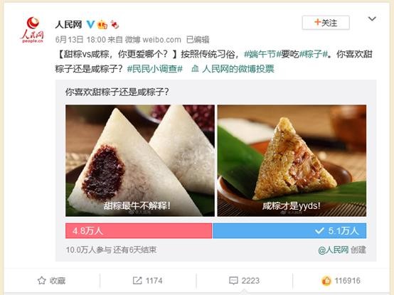 舆论是群体性的意见。群体性的意见是指一些人共同的意见。文稿写到这里深夜0点已过,码字的此刻是2021年6月14日凌晨2点,已是端午节。那么就是端午吃粽子为例来说事比较合适。刚好几个小时前人民网官方微博发了一个关于端午节吃粽子【甜粽vs咸粽,你更爱哪个?】的小调查,截图如下: