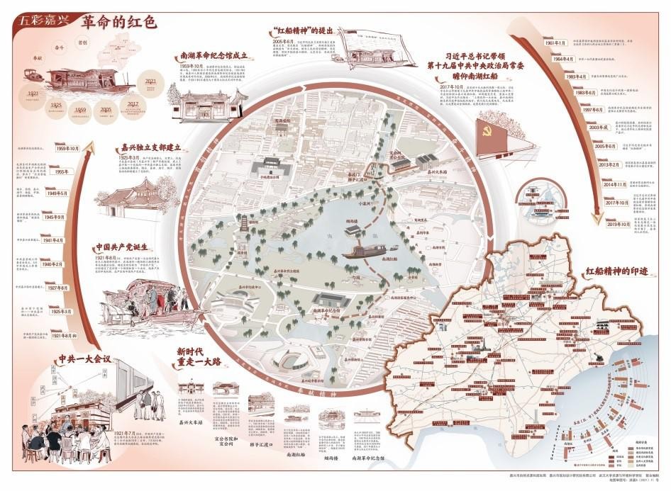 《五彩嘉兴地图》以“五彩嘉兴”为主题,包含革命的红色、经济的蓝色、文化的青色、生活的金色、生态的绿色五张专题地图,采用叙事性的地图语言、图文并茂的编排设计,全景式展现了嘉兴政治、经济、文化、民生、生态全方位现代化发展的辉煌成就和最新发展成果,彰显城市精神品格,展示城市发展成就,是回应社会民生关切的“城市名片”,具有重要的科学价值和实用意义。