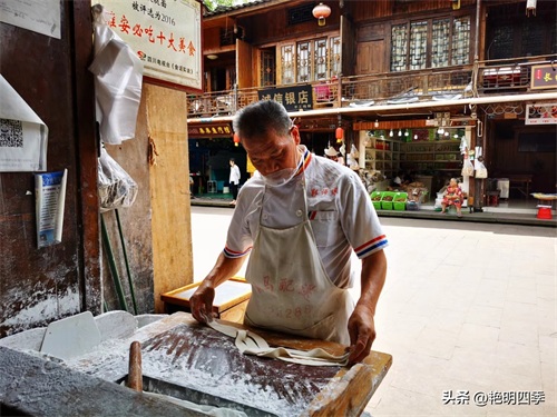 最红的挞挞面是郭师傅家。郭师傅相当能做广告,他边擀面,边高声吆喝,宣称镇上他不是第一,别人不敢说第一。我们观察,他擀的面确实是又匀又薄。他也特别欢迎拍摄,不像别的铺子那样似乎还不太愿意。在他的建议下,我们吃了一碗油泼面。非常劲道。