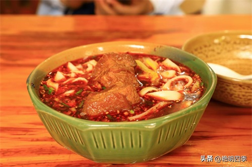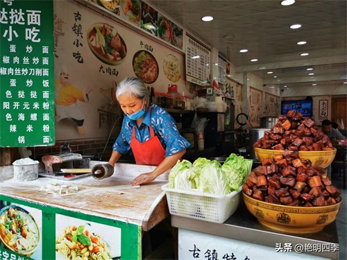 小镇上最活色生香的是挞挞面铺子。硕大的坨坨肉就摆在铺子门口,老板当街啪啪地挞着面条。有好几家被各电视台报道过的网红铺子。我们吃了一家,味道确实不错。