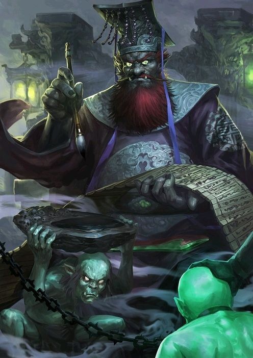阎王在中国民间影响很大,传说他是阴间的国王,人死后都要到阴间去报道,接受阎王的审判,生前行善者,可升天堂,享富贵,生前作恶者,会受惩罚,下地狱。又有十殿阎罗之说。这一说法始于唐末。分别是:秦广王、楚江王、宋帝王、五官王、阎罗王、卞城王、泰山王、都市王、平等王、转轮王。此十王分别居于地狱的十殿之上,因称此十殿阎王。