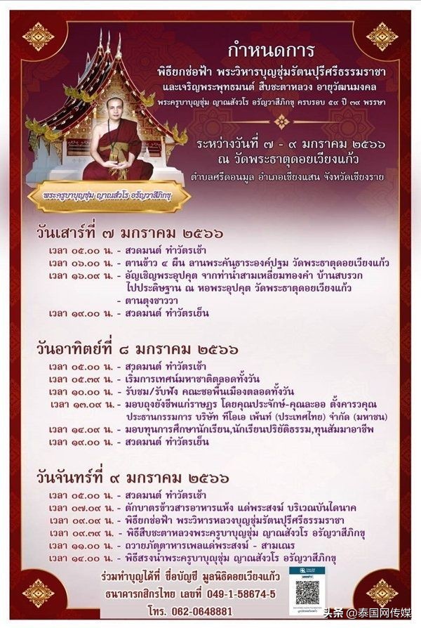 据泰媒报道,此前有消息称缅甸古巴文春大师计划于1月7-9日前往泰国清莱府清盛县Doi Wiang Kaew寺举行相关佛教仪式。