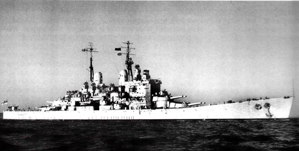 (前卫”号1950年舰姿,与建成时相比,后桅上部缩短并换装了电子设备天线,舰体中部两侧各装4座双联装133毫米高平两用炮,舷侧明显可见装甲带,最大厚度356毫米,比纳尔逊级薄25毫米。)