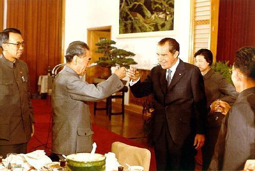 在接待晚宴中 尼克松曾经这样说:“是的 我们之间曾有过巨大的分歧,但是使我们走到一起的,是我们有超越这些分歧的共同利益。”