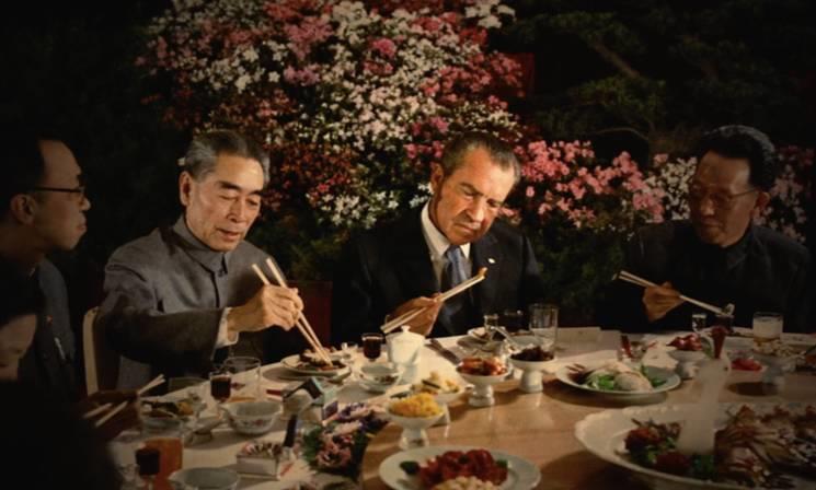 在当天晚上盛大的欢迎晚宴中,顾及到美方客人不会使用筷子,我国工作人员贴心准备了刀叉,众多美国官员纷纷拿起刀叉 大快朵颐。尼克松总统夫妇却娴熟地拿起了筷子。