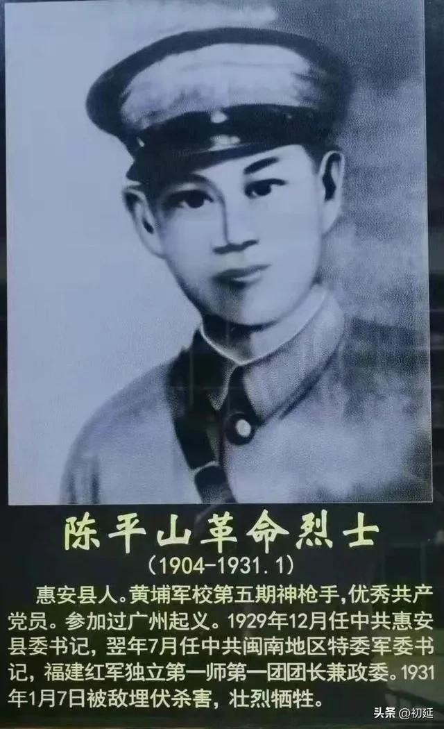 陈平山(1904年—1931年),福建惠安人。毕业于黄埔军校,参加过广州起义,历任中共惠安县委书记、泉州特委军委书记、福建红军第1团团长等职。陈平山是黄埔军校毕业的高材生,在北伐前后,他曾参加武昌攻坚战,是黄埔一军的得力干将。