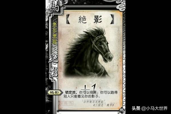 绝影马又称大宛良马,也属千里马级别的极品良骏,为三国时曹操的坐骑。其于正史《魏书》之中也有所提及:“公所乘马名绝影,为流矢所中,伤颊及足,并中公右臂。世语曰:昂不能骑,进马于公,公故免,而昂遇害”。这是说当年曹操征讨张绣时所发生的一场大事故,足称得上是曹操除赤壁之战外最为惨痛的一场败绩。