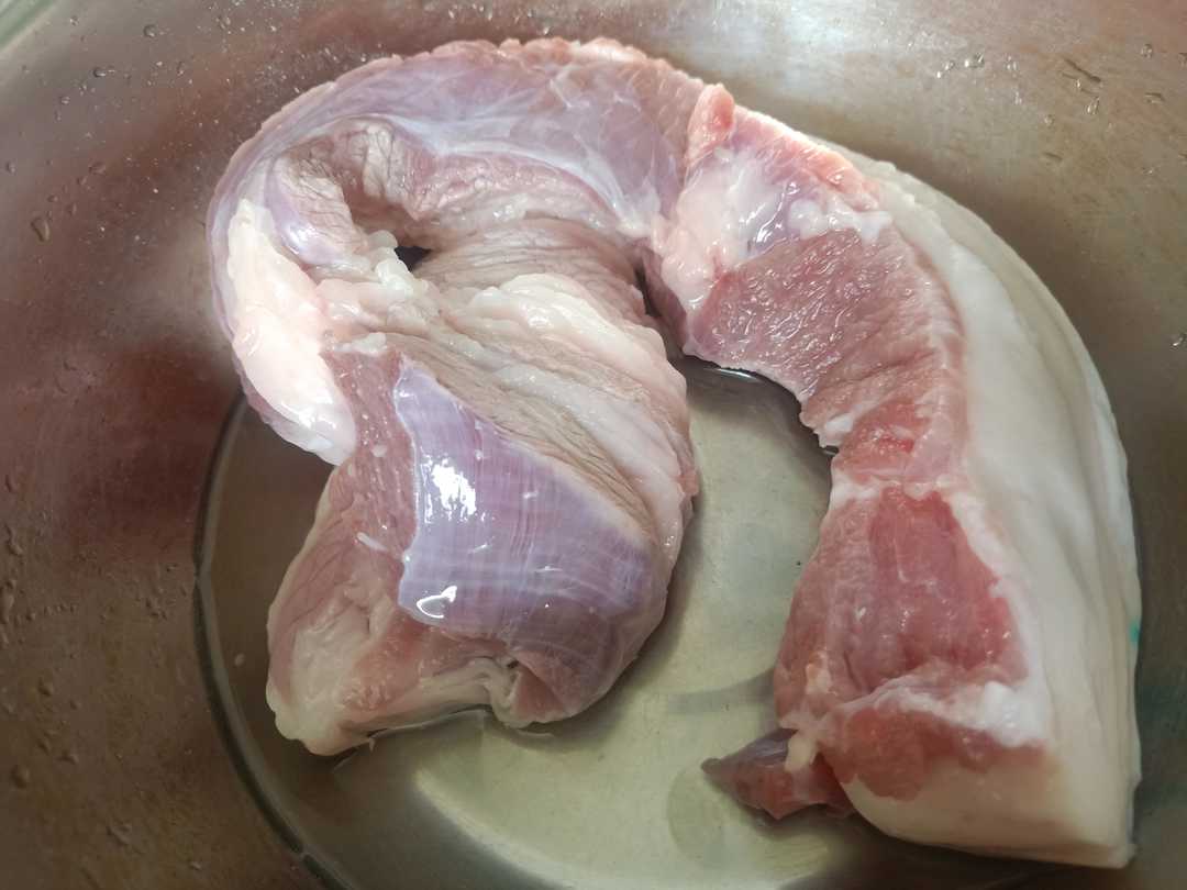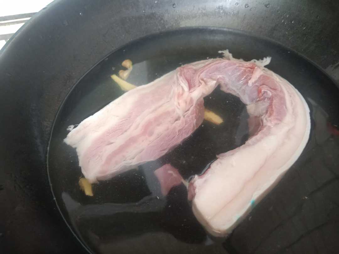 第一步:买回来的肉清洗干净,放在锅里加适量的水,放几片生姜,开火煮开将里面的血水煮出来,并且煮过后的肉比较好切,煮好的肉捞出来过凉水,沥干水分将它切成薄薄的厚片。