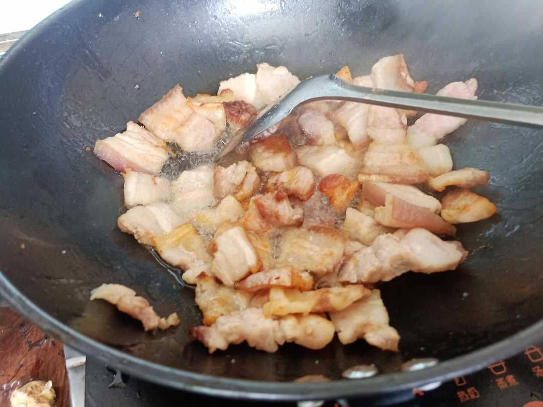 第二步:锅热加加少许油,把切好的肉片倒进去,小火慢煎至两面金黄,把肉捞出来,留够炒菜的油,多余的倒出来,不过要油要比平时炒菜多一半,因为梅干菜比较吸油,油少了做出来的口感就没那么好了。