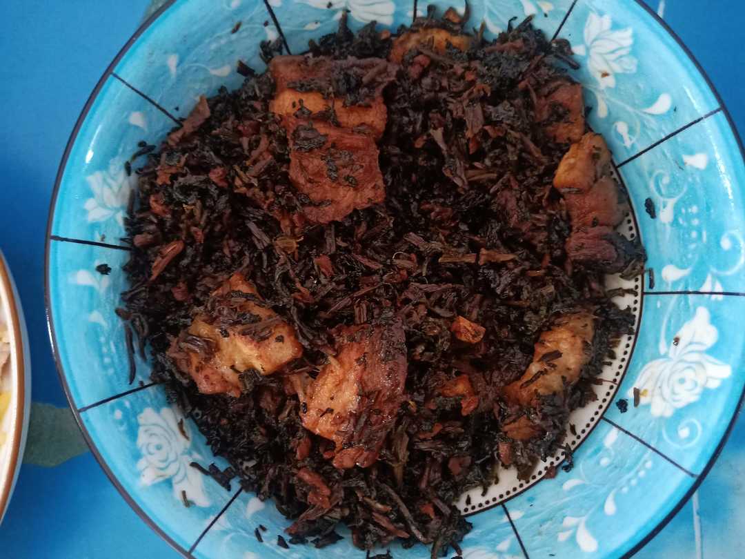 第三步:梅干菜先用少量的水泡软一下,这样炒就不会太干,将梅干菜倒进去,小火翻炒,把水分大致炒干,加入适量的盐、生抽、老抽,煎好的肉也倒进去一起翻炒均匀,炒好后装在一个大碗里。