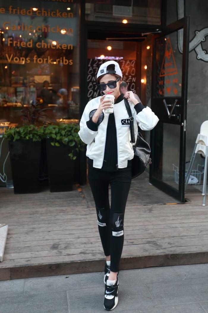 刺绣太阳花棒球服与修身九分裤,简约精神充满运动感气息,非常适合现在喜欢中性风的女孩子。