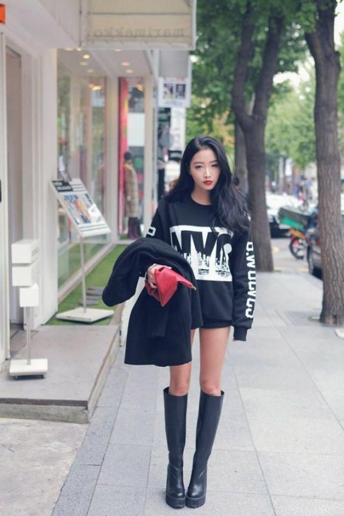 我自己也有一双靴子质感的胶鞋呢!不过这样胶质感的长筒靴更适合腿长的妹子,休闲宽大的黑色字母卫衣,将会是接下来的初秋季风靡日常街头的时尚单品。你想好怎么搭配它了吗?