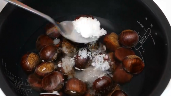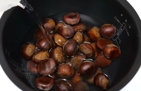 全部弄好之后,把板栗放入电饭锅中,加入水,注意水位不能超过板栗的高度,一定要微微低于板栗。这样,板栗不会因为水过少糊掉,也不会因为水过多煮出来的不入味不好吃。