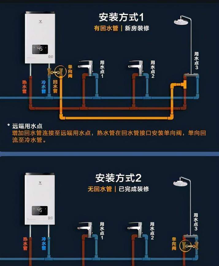 热水回路怎样安装呢?这里有两种方法,一种是水路还没有装修好的,在安装时多放一根热水回水管到热水器安装处,这样的效果是最好的;另外一种是,家里水路已经安装好了,这种情况下就要在离热水器最远的一个用水龙头处加三通把冷热水链接起来,形成一个闭环热水回流,具体如图所示。