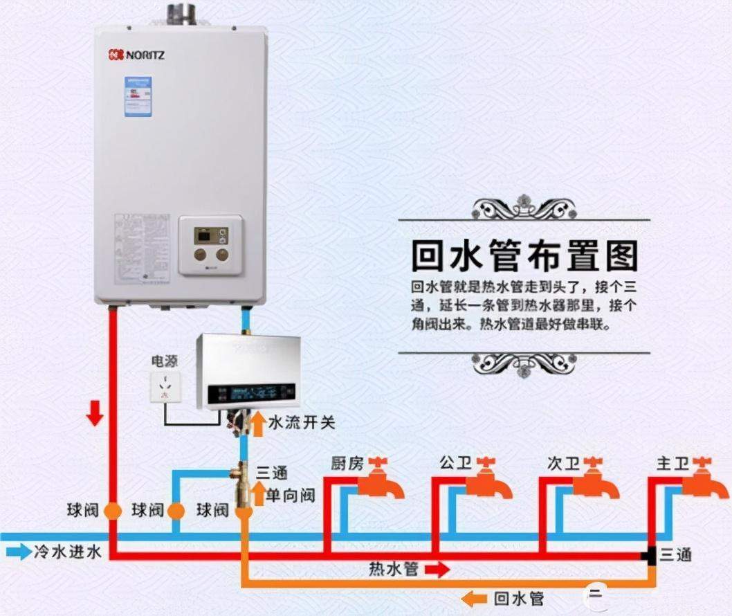 热水回路原理其实并不复杂,但回水管安装一定要注意,水流开关必须垂直向上安装,单向阀箭头必须由回水朝向冷水。另外热水管增加一层保温层,防止水管太长而使热水冷却过快。