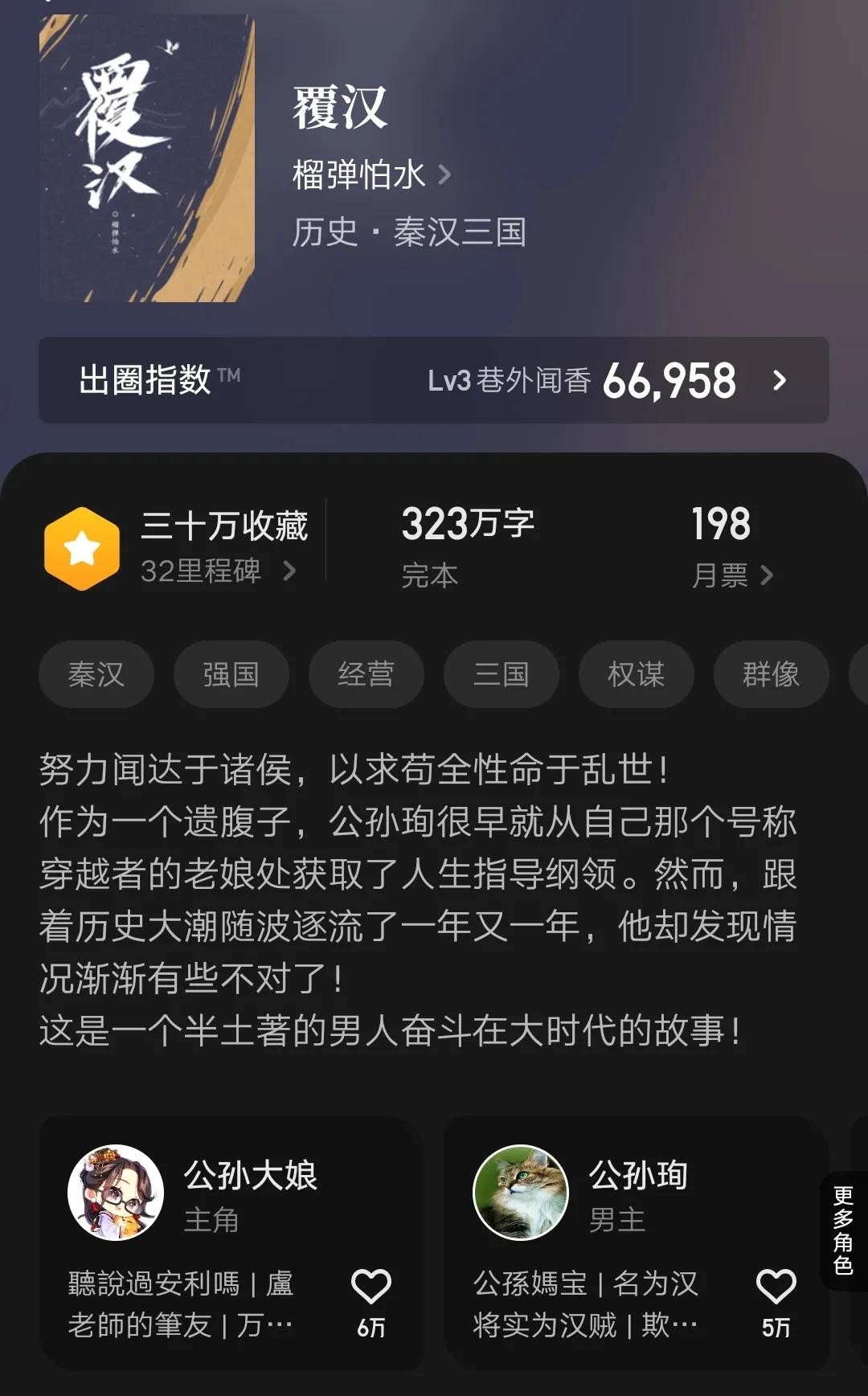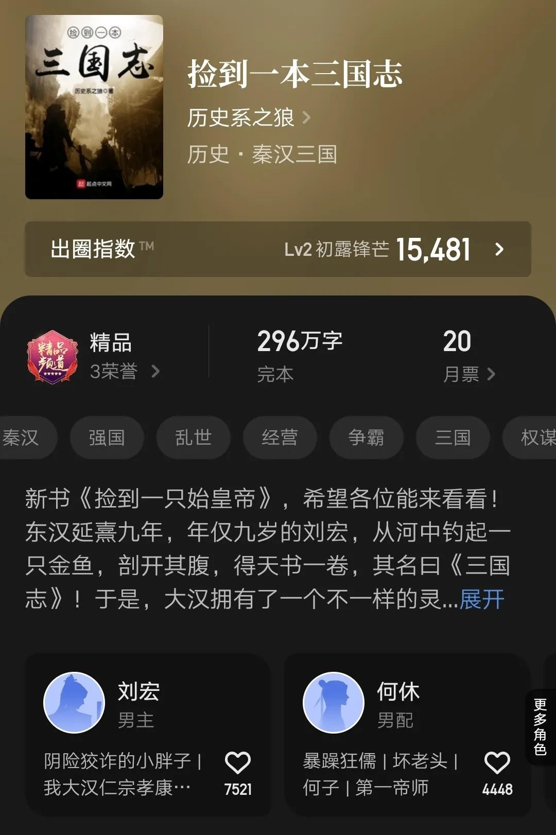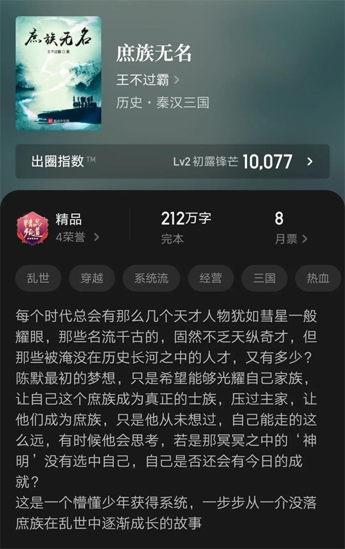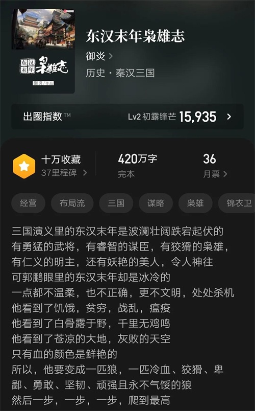 这本是去年初完结的三国类小说,近年作品中的精品小说。