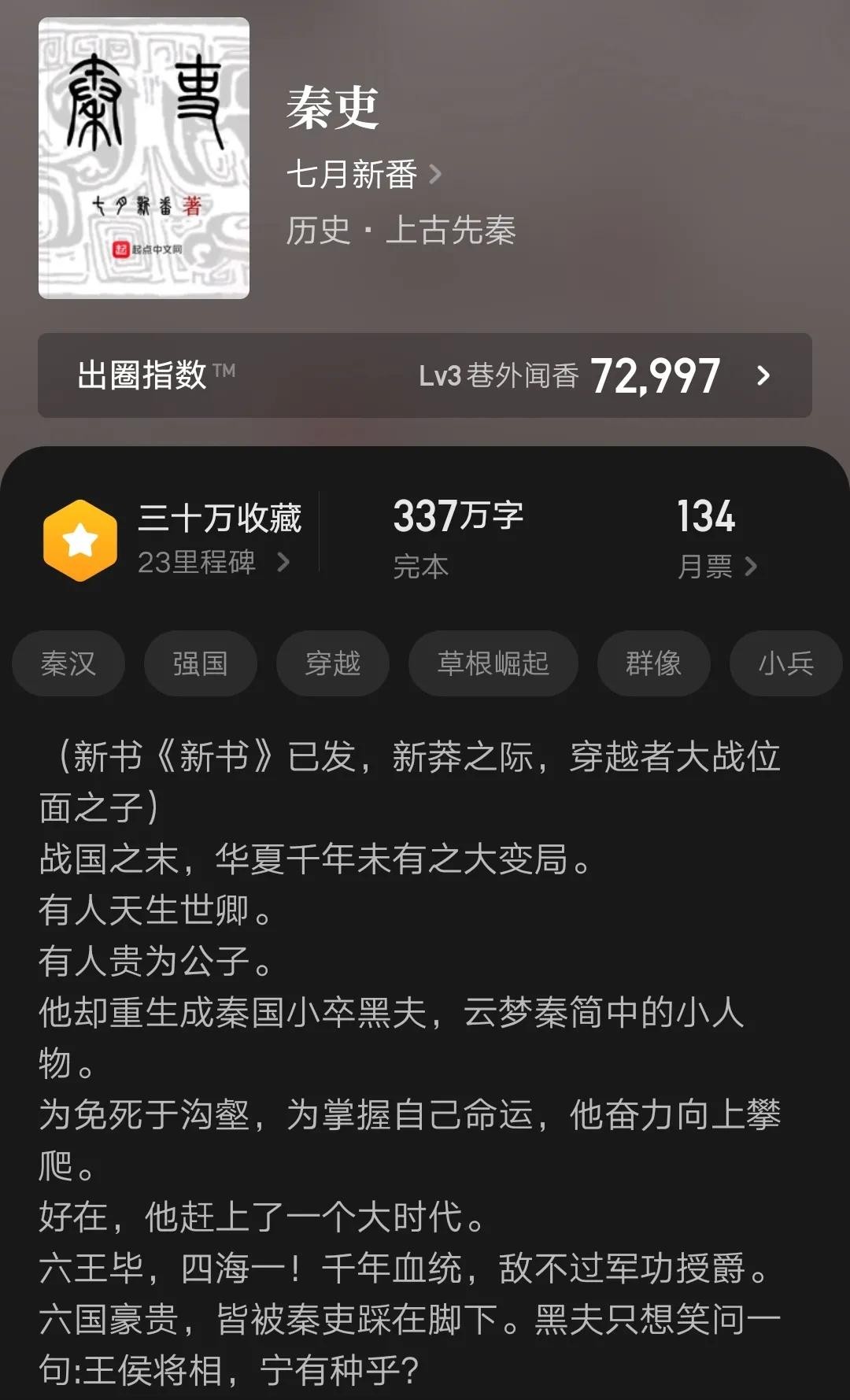 作者引用了历史里真实存在的一个小人物“黑夫”,让主角穿越成没有参加战争之前的他,一个平民,农夫之子。为了避免在以后的战争中成为炮灰,主角开始为自己谋算,从小小驿站开始了这波澜壮阔的一生。