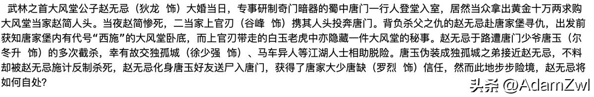 原著精彩至极,堪称古装版的无间道,影版有改动篇幅大,除了赵无极的妻子出现的时间和行为不合理外,整片堪称完美,特别是施思饰演的唐羽,太可惜了,