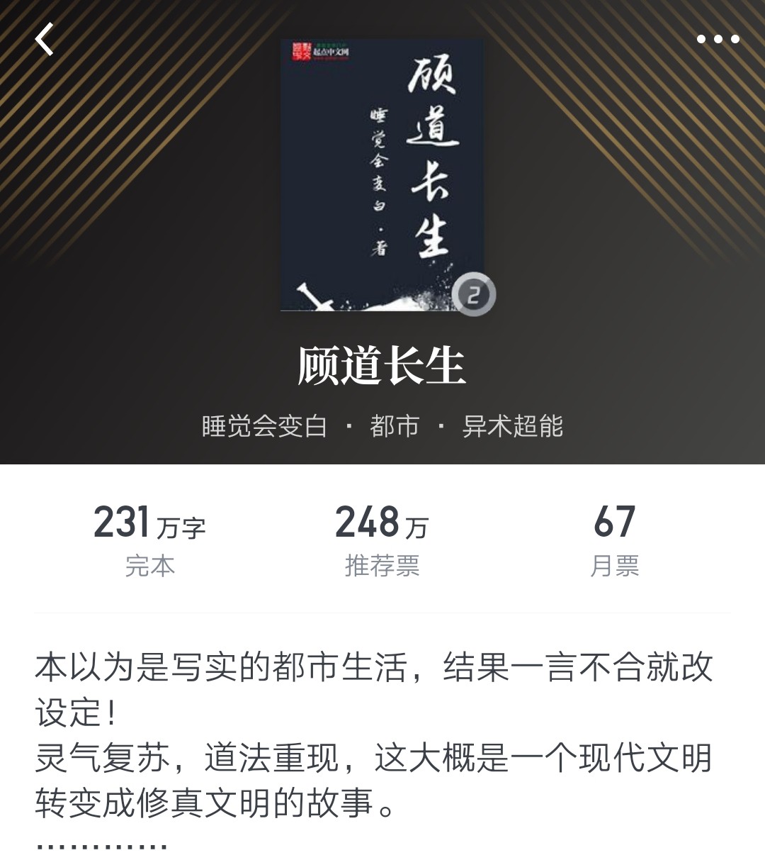 我不知道别人看过哪些灵气复苏的小说,但《顾道长生》应该是我看过的第一本。