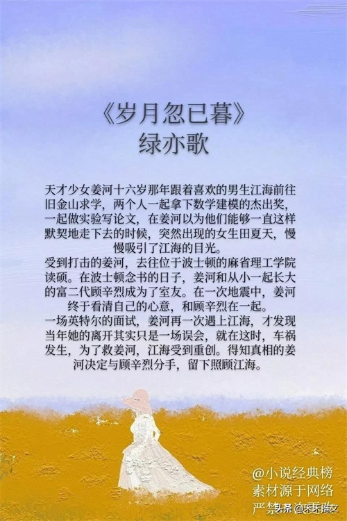 之前禾禾推荐过的绿亦歌的《岁月忽已暮》也很好看哦!当然作者的其他书禾禾也看过了,绿亦歌的小说读着总带着淡淡的忧伤,有些虐,有些结局不圆满,喜欢这一类型的读者可以去看看哦!