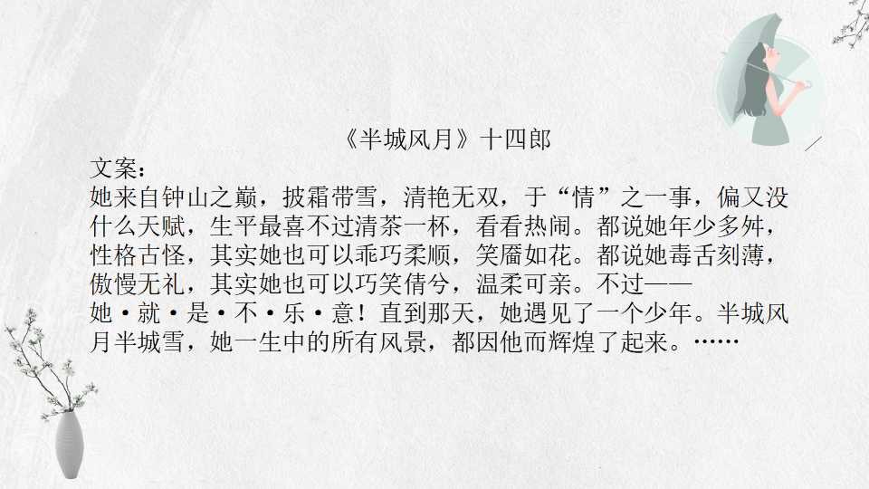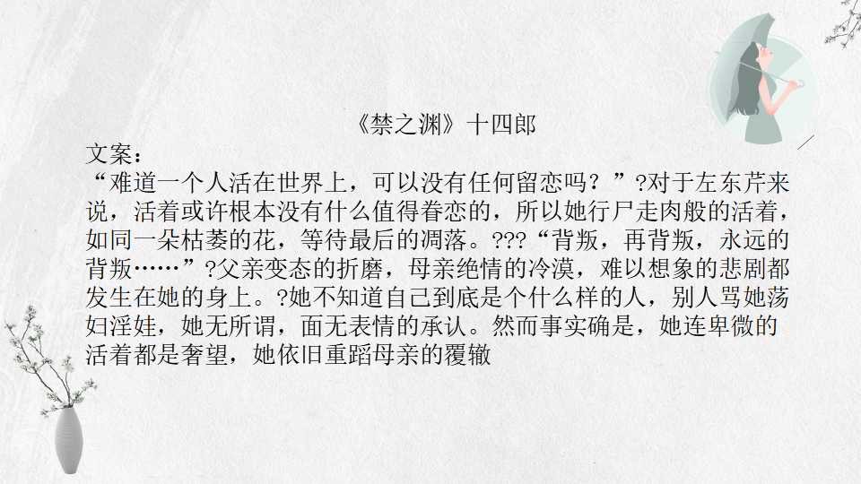 十四郎,觉得十四郎的名字听起来像男生,披着十四十四的号写了琉璃和跑江湖两篇文。她的小说多以古言仙侠为主,剧情流畅,文笔清新,人物饱满。早期还有个马甲号“半袖红雪”,这个马甲下的文大家自己搜吧。她的小说,除了寥寥无几的两篇现代文,其余作品都是古言仙侠,喜欢此类文的小伙伴不要错过。