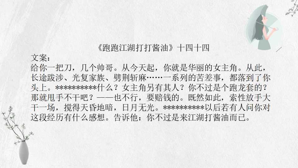 2、 《跑跑江湖打打酱油》十四十四 49万字 BG 完结