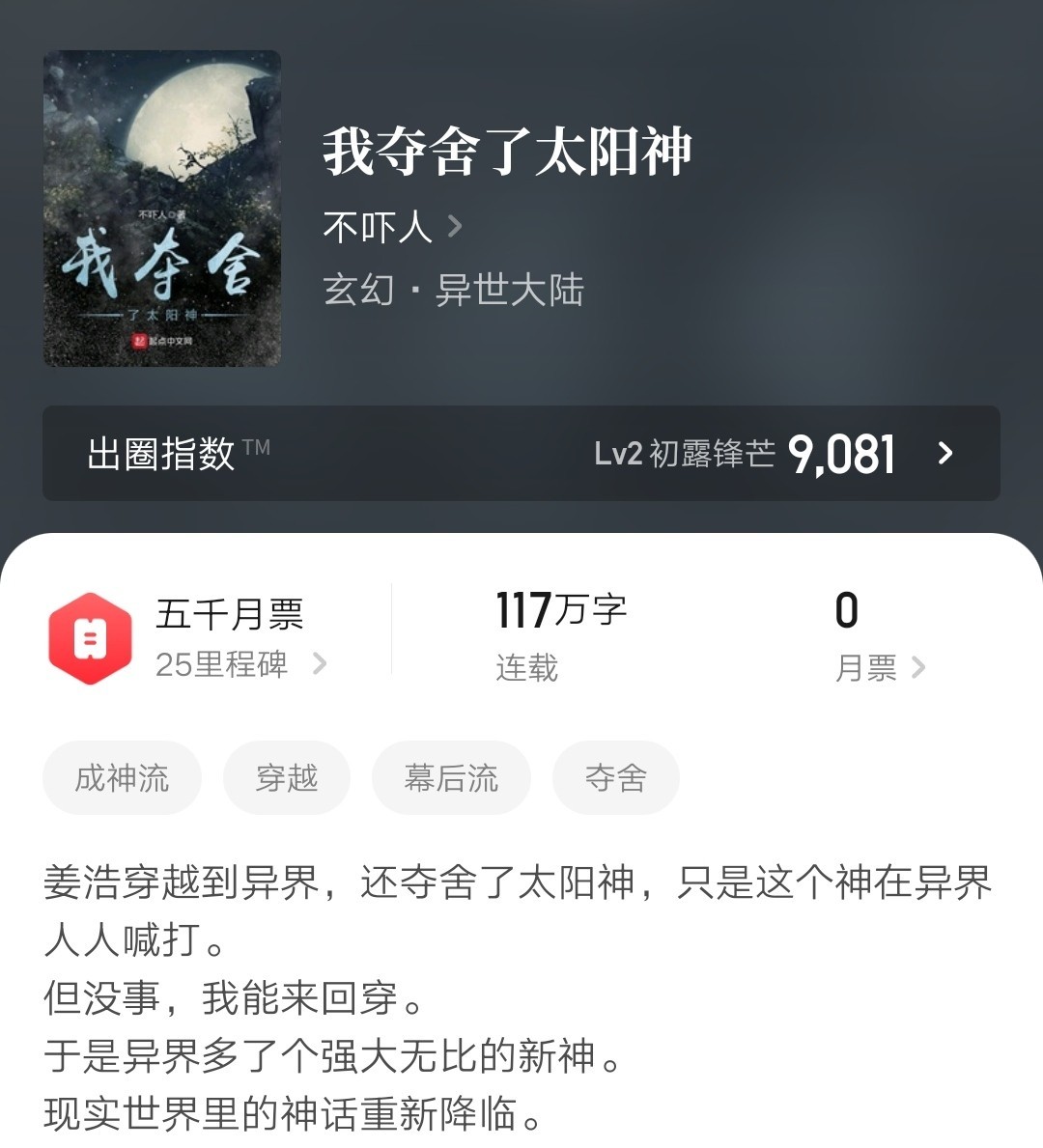 书评:这是一部双穿文,幕后黑手文。主角姜浩穿越到异界成为太阳神,但是,因为不在相对应的体系之中,被别人各种喊打喊杀,幸好可以回到原本的位面,可以调整状态,吸收各种信仰之力,于是,然后一边在异世界苟着发育,一边在地球收集信仰。然后在地球上扮演各个神灵人前显圣,看角色栏里面应该还有克苏鲁。主角幕后就完事了,各种马甲。