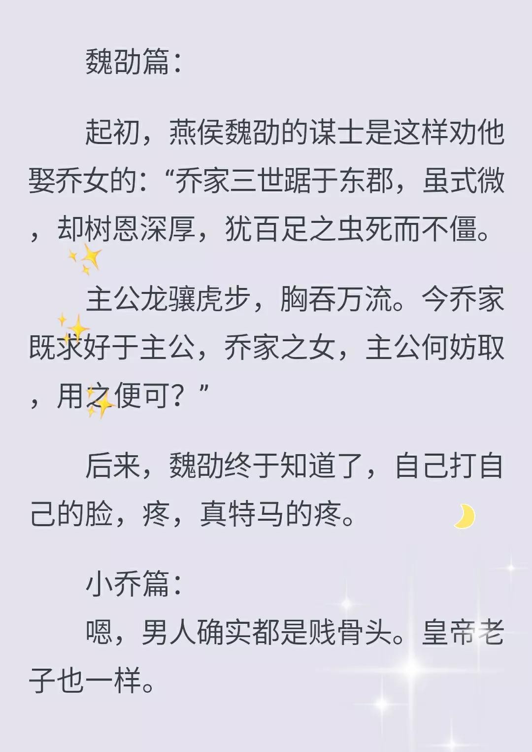 魏邵后来释怀了,他从以自我为中心到站在小乔的角度考虑,他说“蛮蛮,从前我总为自己感到委屈,我也不止一次的在你面前提过,因为你,我违心的做了如何如何的退让,但我却从不去想,你会因为我的这种想法而承受着何等压力和委屈。你生来不是要到我魏家替你那个死去的祖父来赎罪的,即便当初是这样,到了如今,早也不欠什么了,反倒是我,忽略你太多”。