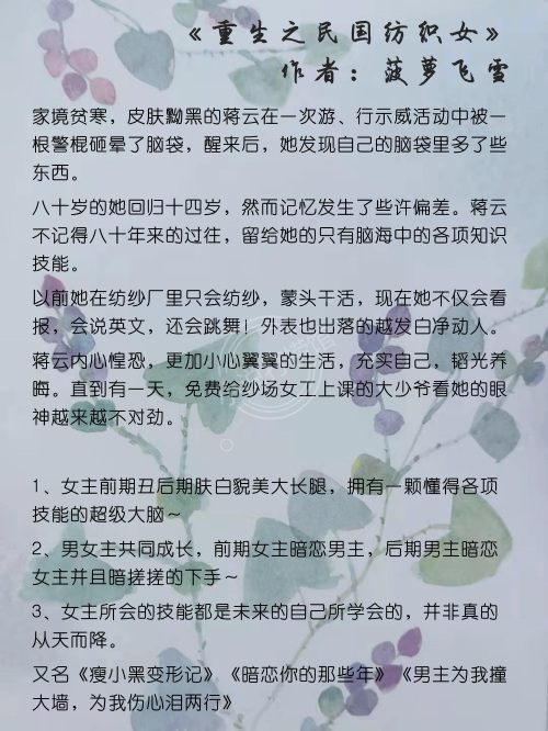 3.《重生之民国纺织女》 作者:菠萝飞雪