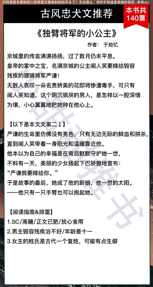 【短评】古言,男主残疾,忠犬,甜文,公主,整个文章其实真的很甜,就是两个人的相处日常,然后日久生情,小公主深谙世故却不世故,很欣赏她对所有人都保持着善良的态度。独臂将军的绝望,然后很真实的表现出了他的不安全感,感觉这比较像是女性的特点。对于宫斗和天家斗争笔墨不多,情节合理,文笔不错,情感细腻。