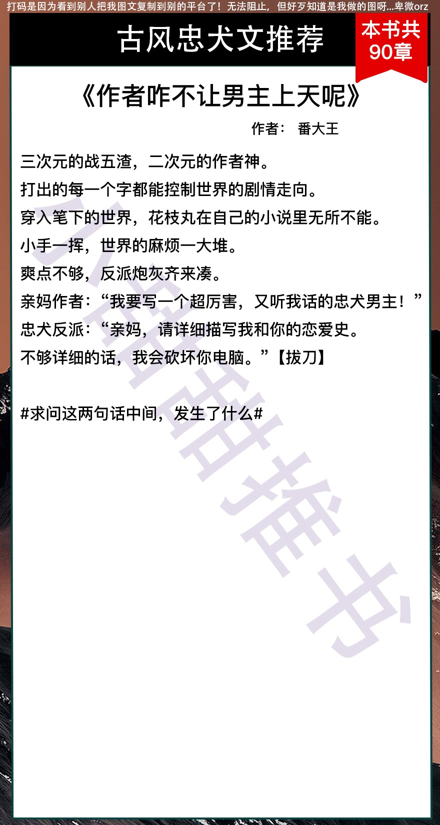 【短评】穿书,脑洞,忠犬男主,轻松向,题材在所有书穿中算翘首,哈哈哈,最后还反转,男主忠犬,bg文,he,番大王的书没有不好看的。满足恋爱少女心。