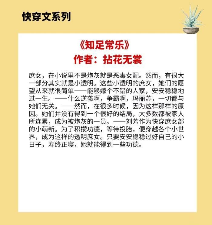 短评:以修补天道为背景快穿文,女主死后魂归到地府,却发现在新时代,也有一个新地府。智能现代,居然连投胎都需要先等待两干年~既然如此,她只好继续在地府之中工作,成为快穿部下属的庶女知足常乐分部的一位实习职员,穿梭各个任务世界赚取功德,等待投胎。这是一篇讲述女主角生活记的快穿文,中间穿插了不同副本世界的不同故事。女主角尽管做的是庶女安稳度日的任务,但在做任务期间都是超额完成,里面她都是以天下苍生为己任,做出的都是利国利民的好事,因此才有浓厚的功德圆满,故事是一个个独立的小章节,不是以恋爱或者虐渣为主线,有的故事也的很不错,这篇文,表面看很简单很轻松,内核却很强大,如何过好人生,立足点不错,平凡中见深意,值得推荐!字数215万,已完本。
