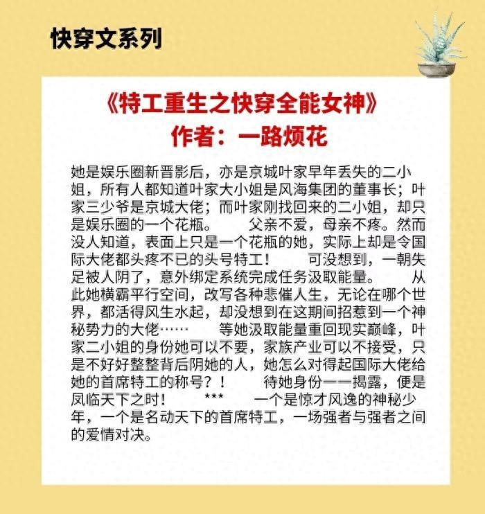 一、《特工重生之快穿全能女神》 作者:一路烦花