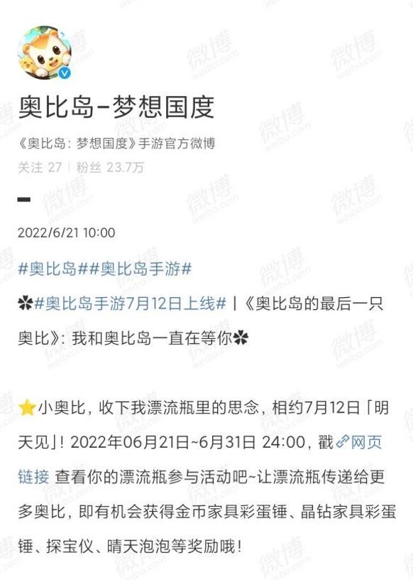 6月21日上午10点,《奥比岛-梦想国度》官方微博发布公告,宣布《奥比岛》手游将于7月12日上线,正式开始公测。该消息勾起了众多95后、00后玩家们的童年回忆,网友们欢呼到,“上岛啦上岛啦,终于能上岛啦!