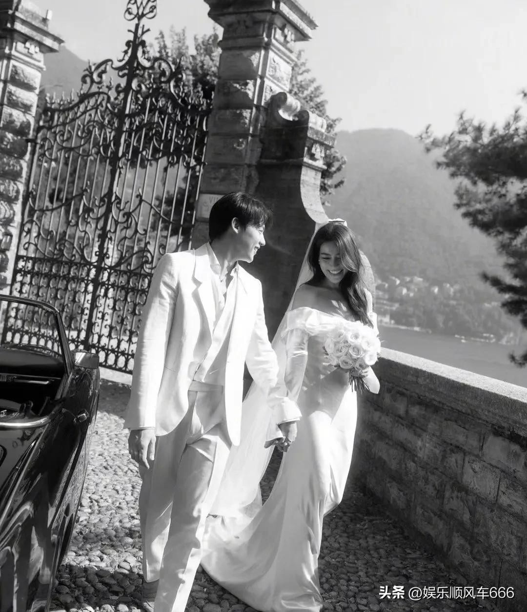Kim身穿美丽的婚纱,Mark身穿白色西装,站在豪车前相视而笑,完全跟电视剧里面的画面无差,有种超甜偶像剧中的帅气王子和漂亮公主走进现实的感觉。