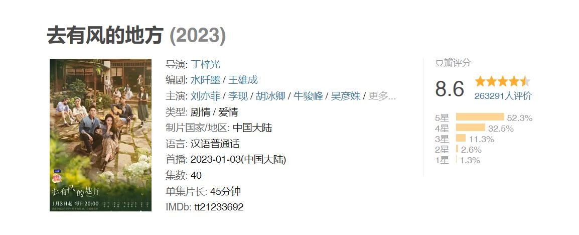 这部剧由刘亦菲和李现主演,田园治愈剧。本来冲着神仙姐姐的颜值看的,看完之后却发现吸引人的除了美人美景,还有剧中的美好。2023年1月播出,26万人打分,评分8.6分。