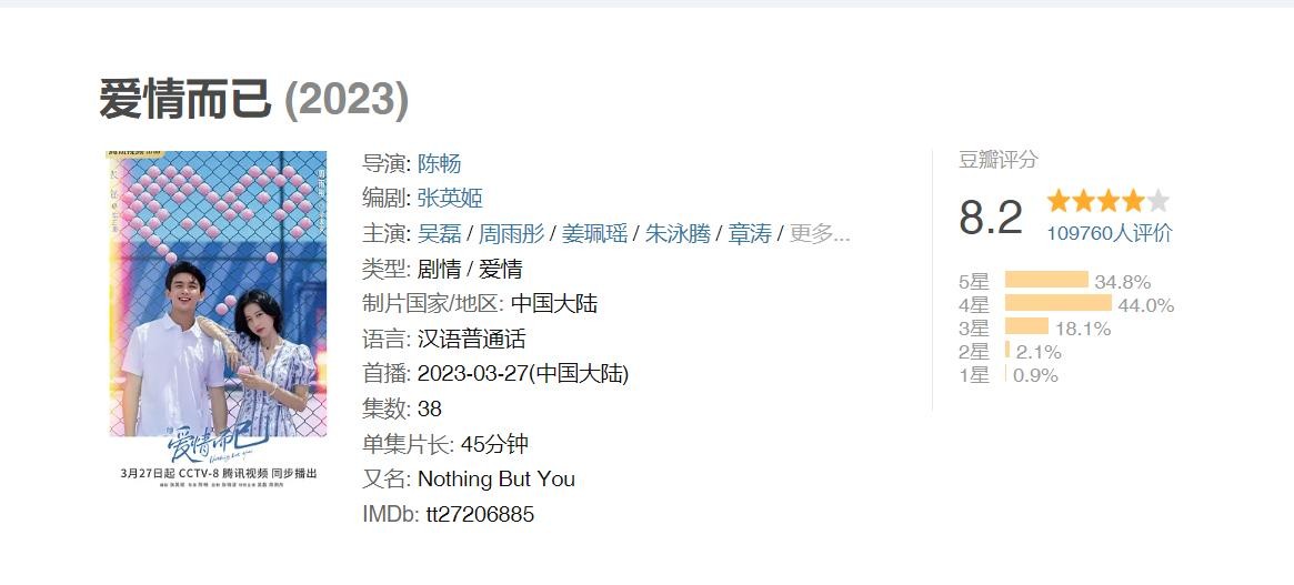 这部剧由吴磊和周雨彤主演,姐弟恋题材,感情积极向上正能量十足,好评不断。《爱情而已》讲的不单单是爱情,更多的是成长。如果仅仅只是一场姐弟恋,大概不会引发这么多人的共鸣。在这部剧里,能看到双向奔赴,也能看到人生的双向救赎。2023年3月播出,近11万人打分,评分8.2分。