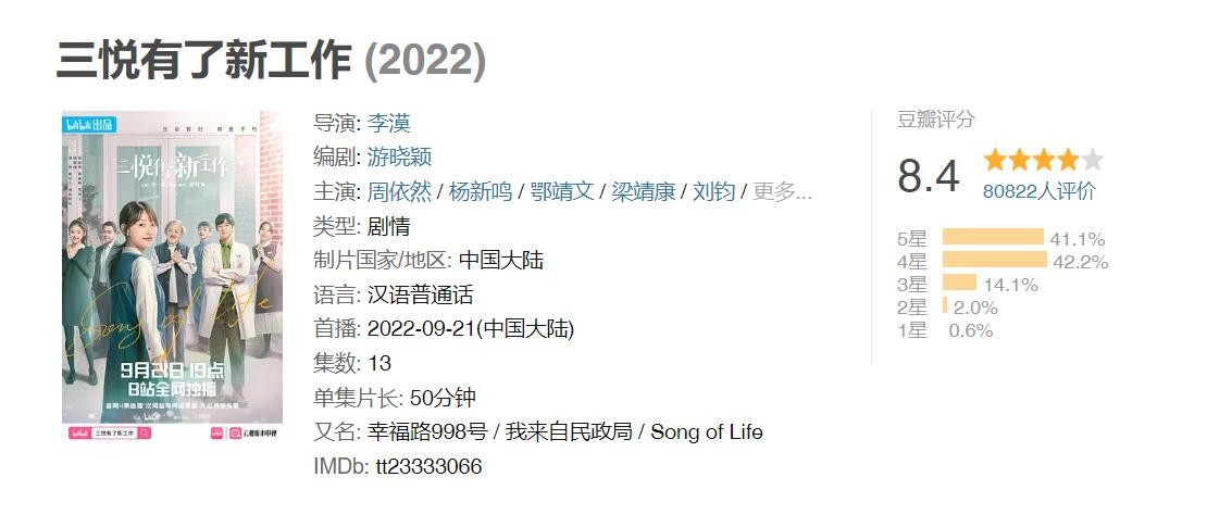 这部剧由周依然、杨新鸣主演,治愈爱情剧,小网剧大惊喜。这部剧用最温情的笔触描写了一群在殡仪馆工作上班的摆渡人,虽然以死亡为背景,但确实在讲述着一个如何让我们好好活着的故事,用死亡的故事告诉我们生的可贵。2022年9月播出,8万人打分,评分8.4分。