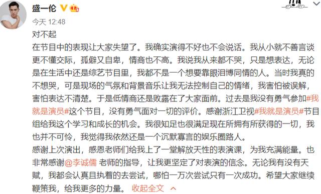 值得一提的是,在李诚儒、章子怡、于正接连批评之后,盛一伦也是想明白了很多,在节目播出后的第二天就发文道歉了。