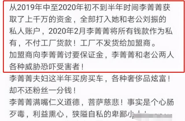 还有网友爆料称,夫妻二人收取了上千万的加盟费,却将其作为私有,面对粉丝和加盟商的质疑,李菁菁和小老公刘振甚至采取各种方式威胁恐吓。